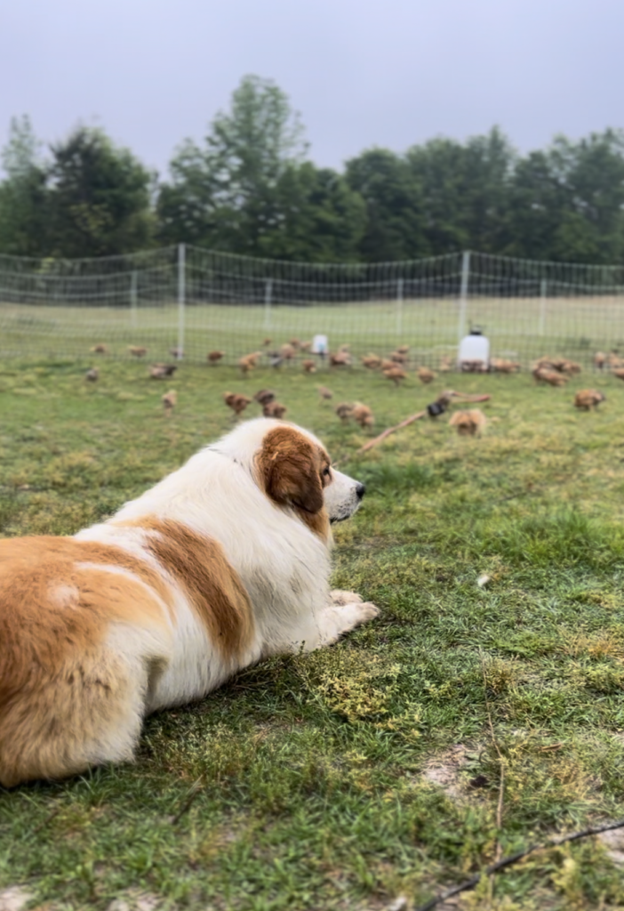 We’ve made a conscious decision not to contribute to the factory-farming practices that dominate the poultry industry. Many chickens raised in commercial settings live in cramped, unhealthy conditions, and we want no part of that. Instead, our Freedom Rangers enjoy a life of freedom, with ample space to roam and explore. They are protected by our loyal livestock dogs, ensuring they are safe from predators while living out their chicken lives to the fullest.