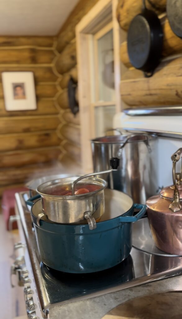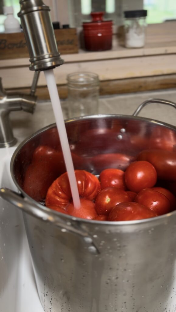 - Prepare the Tomatoes: Begin by washing your tomatoes thoroughly in vinegar water, I use the sink for this. To transform them into juice, simmer them in a large pot until they soften. Use a food mill or a strainer to remove the skins and seeds, ensuring a smooth juice. If you do not have a food mill you may use a food processor or blender, you would need to remove the skins first by roasting the tomatoes and slipping off the skins before making homemade ketchup.