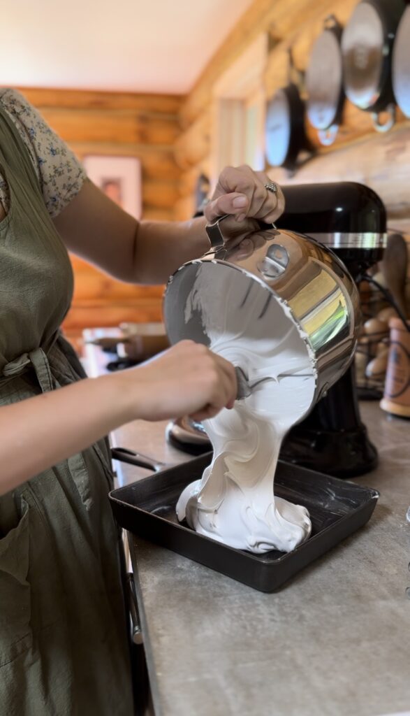 6. Set the Marshmallows: Pour the marshmallow mixture into your prepared baking dish, smoothing the top with a spatula. Dust the top with sifted confectioner’s sugar to keep a crust from forming.