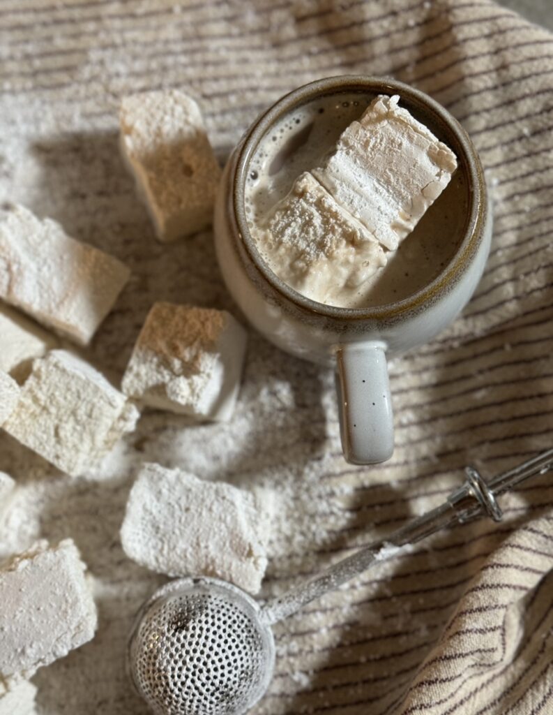 • Storage: Once cut, you can store your marshmallows in a sealed glass jar dusted or ziplock bag dusted with confectioner’s sugar, keeping them fresh for your holiday treats.