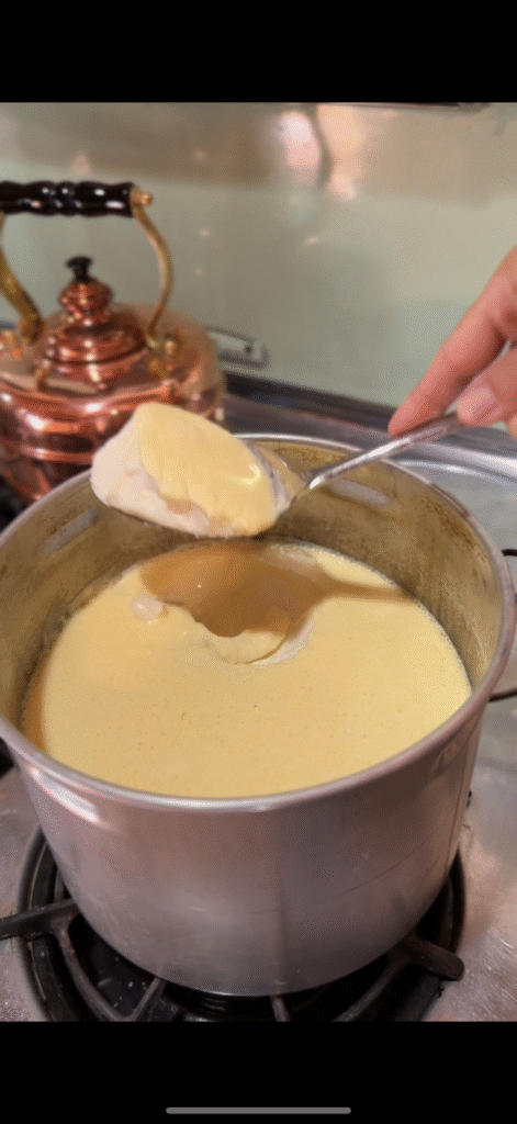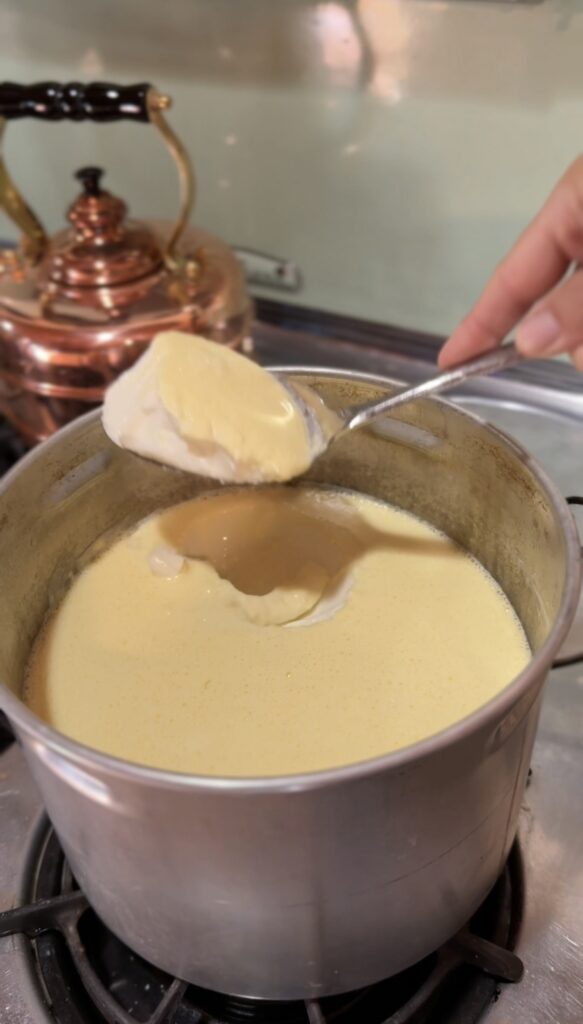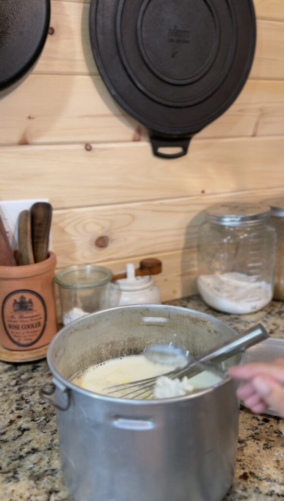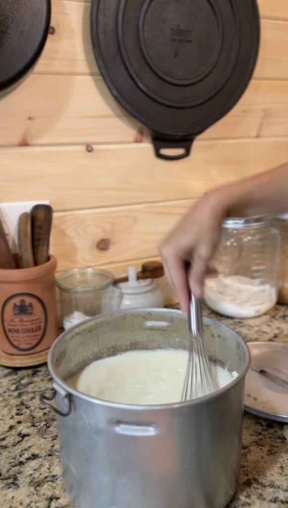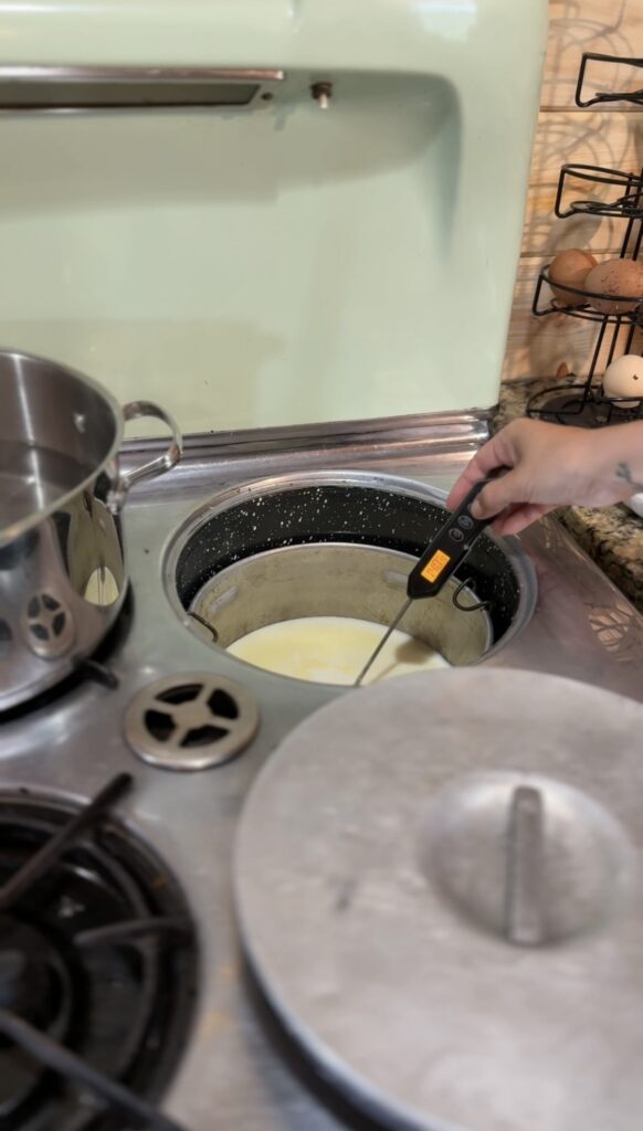 Step 1: Heat the Milk Pour your raw Jersey milk into a heavy-bottomed saucepan or large pot—you’ll need something that can comfortably hold a gallon of milk. The even heat distribution of my vintage Chambers stove is perfect for this, but any stovetop will work. Heat the milk slowly to 180°F (82°C), stirring occasionally to prevent scorching. This temperature pasteurizes the milk and helps create the proper protein structure for thick yogurt.