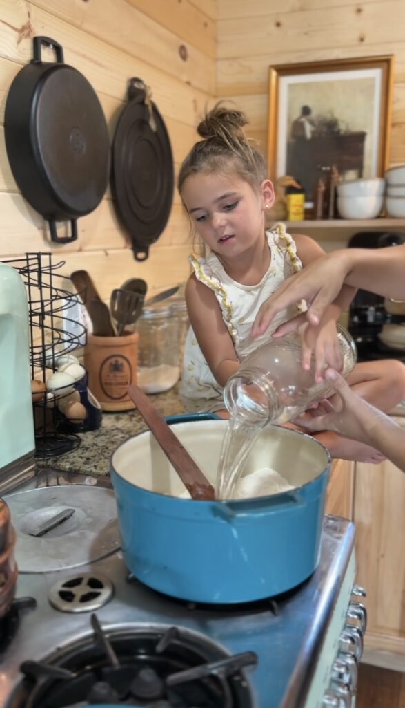 Step 1: Mix Everything in Your Pan Get out a large Dutch oven or heavy-bottomed pan (this prevents sticking and burns). Add all dry ingredients – flour, salt, and cream of tartar – directly to the cold pan.