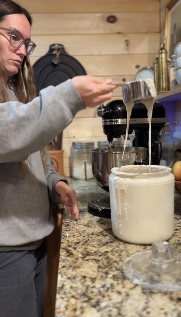 - Combine inactive starter, melted butter, milk, and egg. In another bowl, mix flour, baking powder, salt, and sugar. Bring it all together and let rest for 10 minutes.