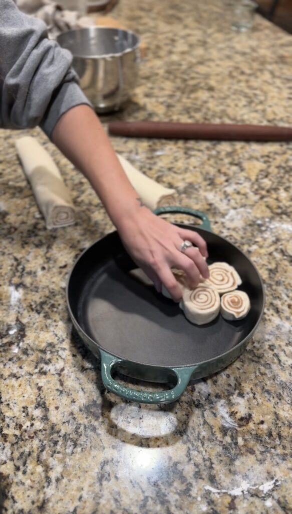 - Roll up tightly, cut into 9-12 rolls, and place in a greased pan.