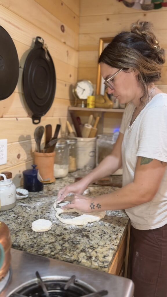 • Shape the Muffins Turn the dough out onto a floured surface and roll it to about 1/2 inch thickness. Using a 3-inch round cutter (or a drinking glass), cut out circles. Re-roll scraps and cut until all dough is used. You should get about 10-12 muffins. Dust both sides with cornmeal and get them on the griddle right away to take advantage of that baking powder lift.