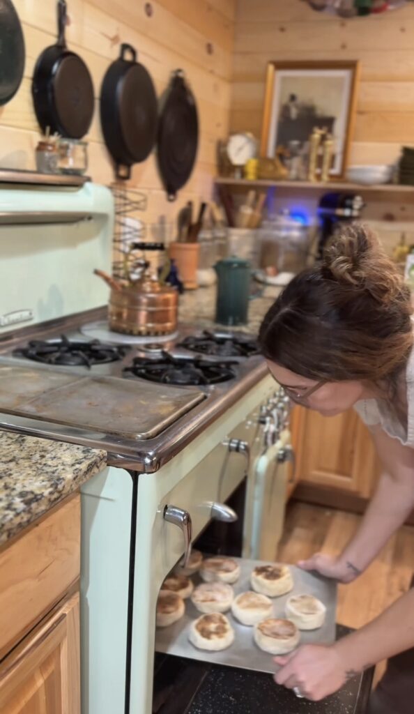 • Cook Preheat your griddle and oven to 350°F. I use my Chambers stove griddle to cook all my muffins at the same time on low heat. This is a huge time-saver when you’re feeding a crowd. Cook for about 5-7 minutes per side until golden brown, then pop them in the oven for a few minutes to make sure they’re cooked all the way through. If you don’t have a large griddle, work in batches on a skillet, cooking for 7-8 minutes per side over medium-low heat.